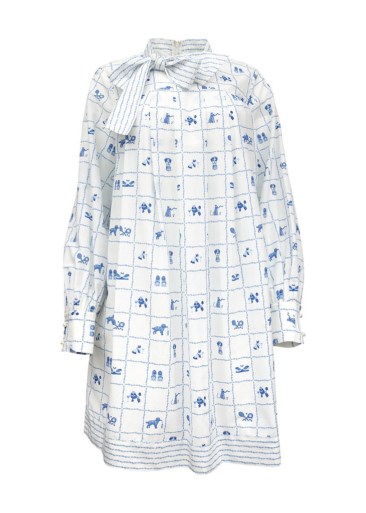 Puffed long sleeve swing dress with functional front neck tie. Cuffs are accented by round faux pearl buttons. Features side seam pockets and back invisible zipper closure. Length is above the knee. Cotton silk blend. Lined. Pockets.