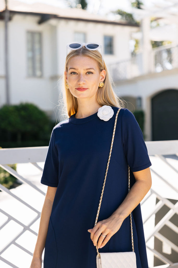 Ponte swing dress. Knee length with side entry patch pockets. Crew neckline. Easy fit with trapeze shape to skirt. Back zipper. Pin on Camellia flower. XS 0-2, S 4-6, M 8-10, L 12-14, XL 16+ |
